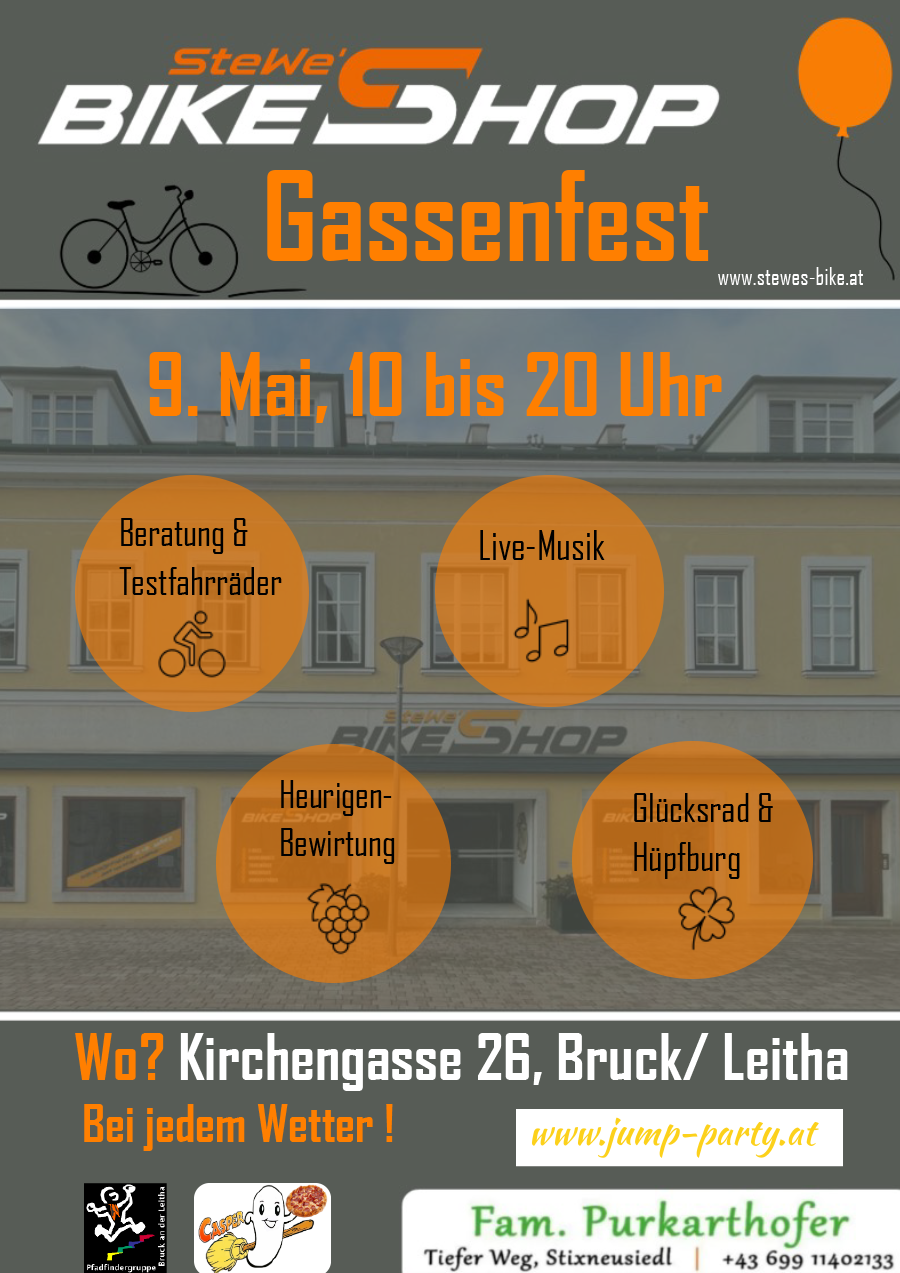 Am 9. Mai 2025 fand unser drittes Gassenfest in der Kirchengasse statt. Unsere Bike-Marken Raymon, Corratec und Scott präsentierten ihre Neuheiten. Der Panoramaheuriger Purkartshofer und die Pizzeria Casper sorgten für das leibliche Wohl unserer Gäste. Zusätzlich konnte man bei unserem Glücksrad großartige Preise gewinnen. Der Reinerlös des Glückrads von 800 € kommt der Heimsanierung der Pfadfinder*innengruppe Bruck/Leitha zugute. Für gute Stimmung bei unserem Fest sorgte Daniel Hejda, der gemeinsam mit seinem Sohn musizierte. Unsere kleinsten Besucher*innen konnten sich auf einer Hüpfburg von Jump-Party aus Bruckneudorf austoben.
